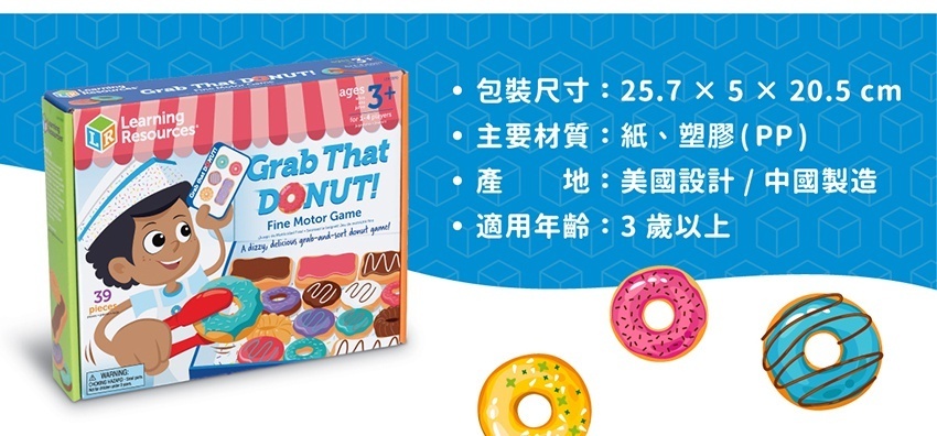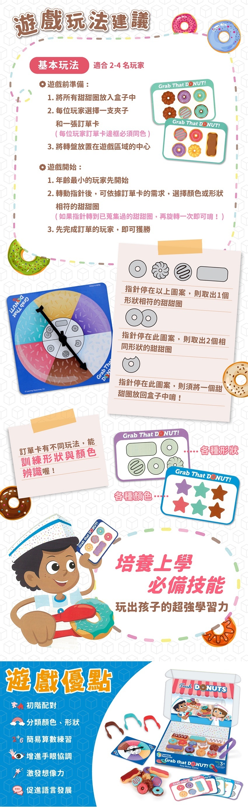 美國Learning Resources甜甜圈開張嘍!試試看完成訂單卡上的需求吧!在情境式遊戲中練習使用工具;學習辨識顏色與形狀,為孩子的握筆、社交和認知能力打好基礎。