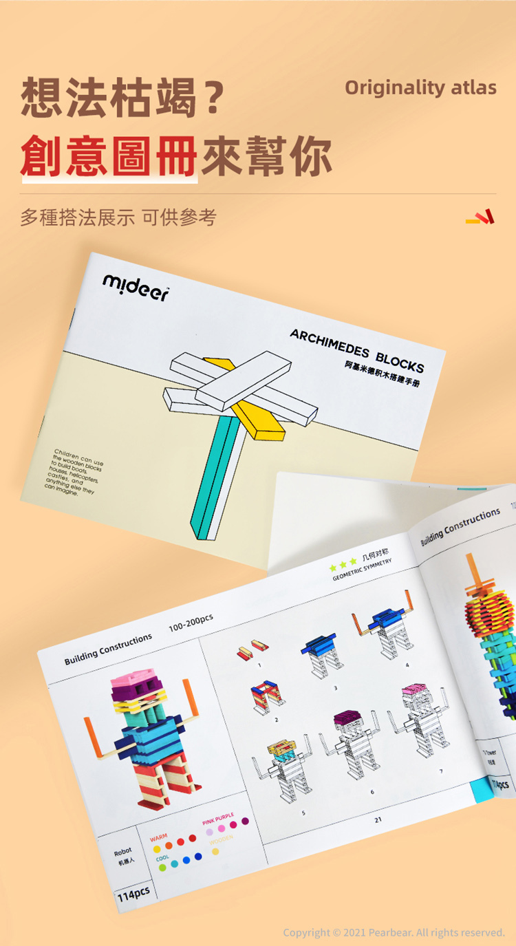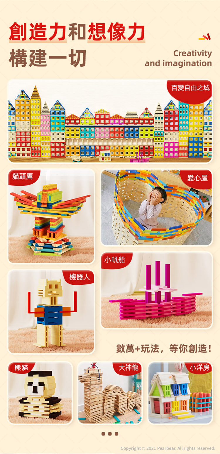 • 組合多達600片,實心松木可聞到木頭香。創意圖冊提供多種搭法可以參考。