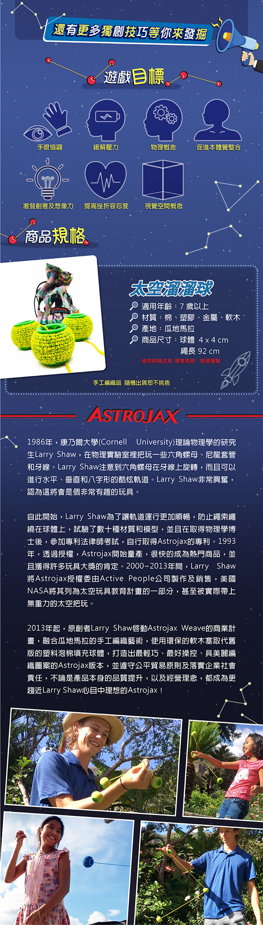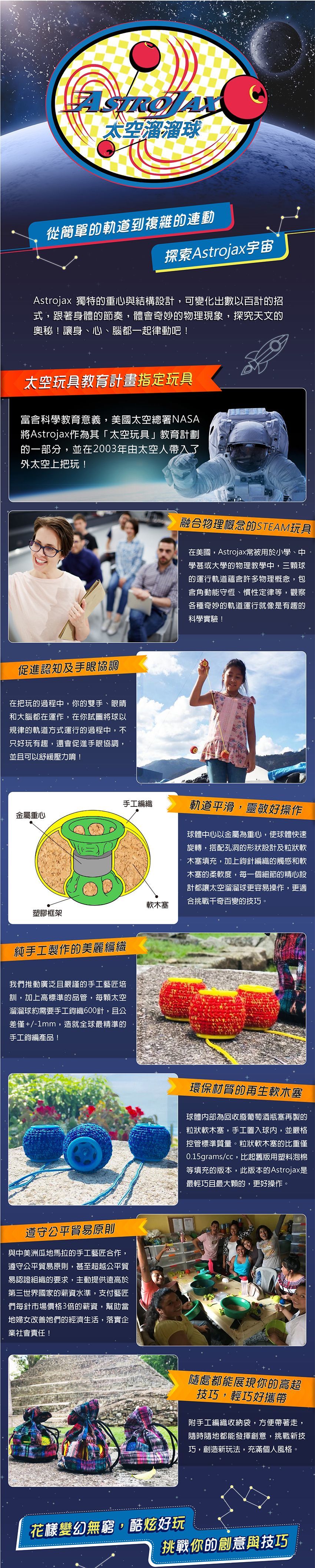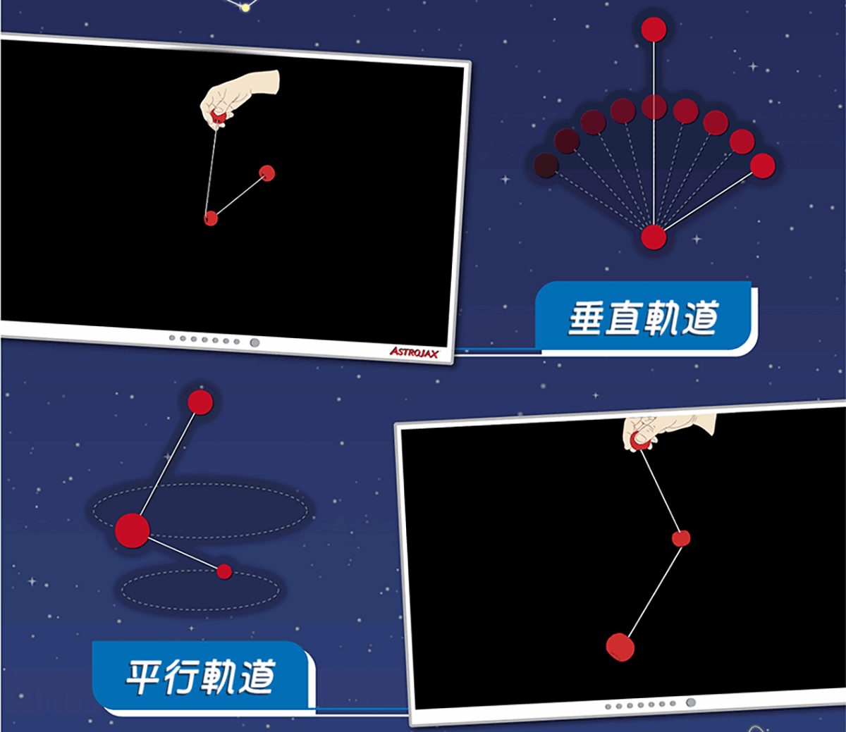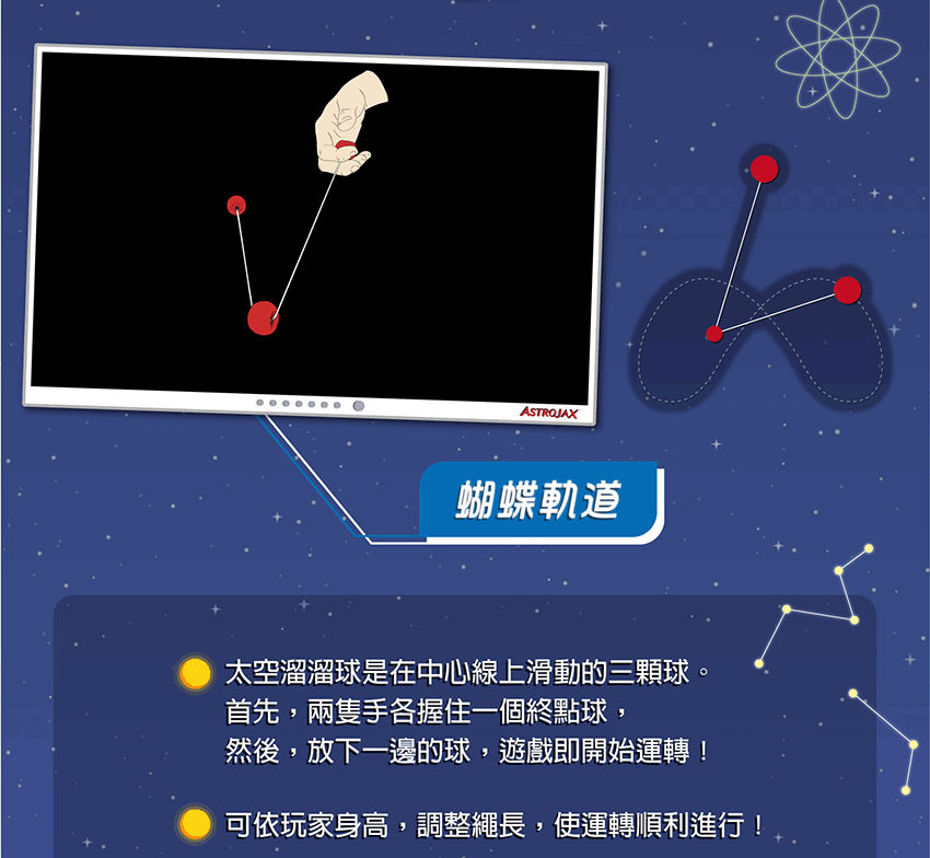 Astrojax常被用於小學、中學、大學的物理教學中,三顆球的運行軌道蘊含許多物理概念,包含角動能守恆、慣性定律等,觀察各種奇妙的軌道運行就像是有趣的科學實驗!