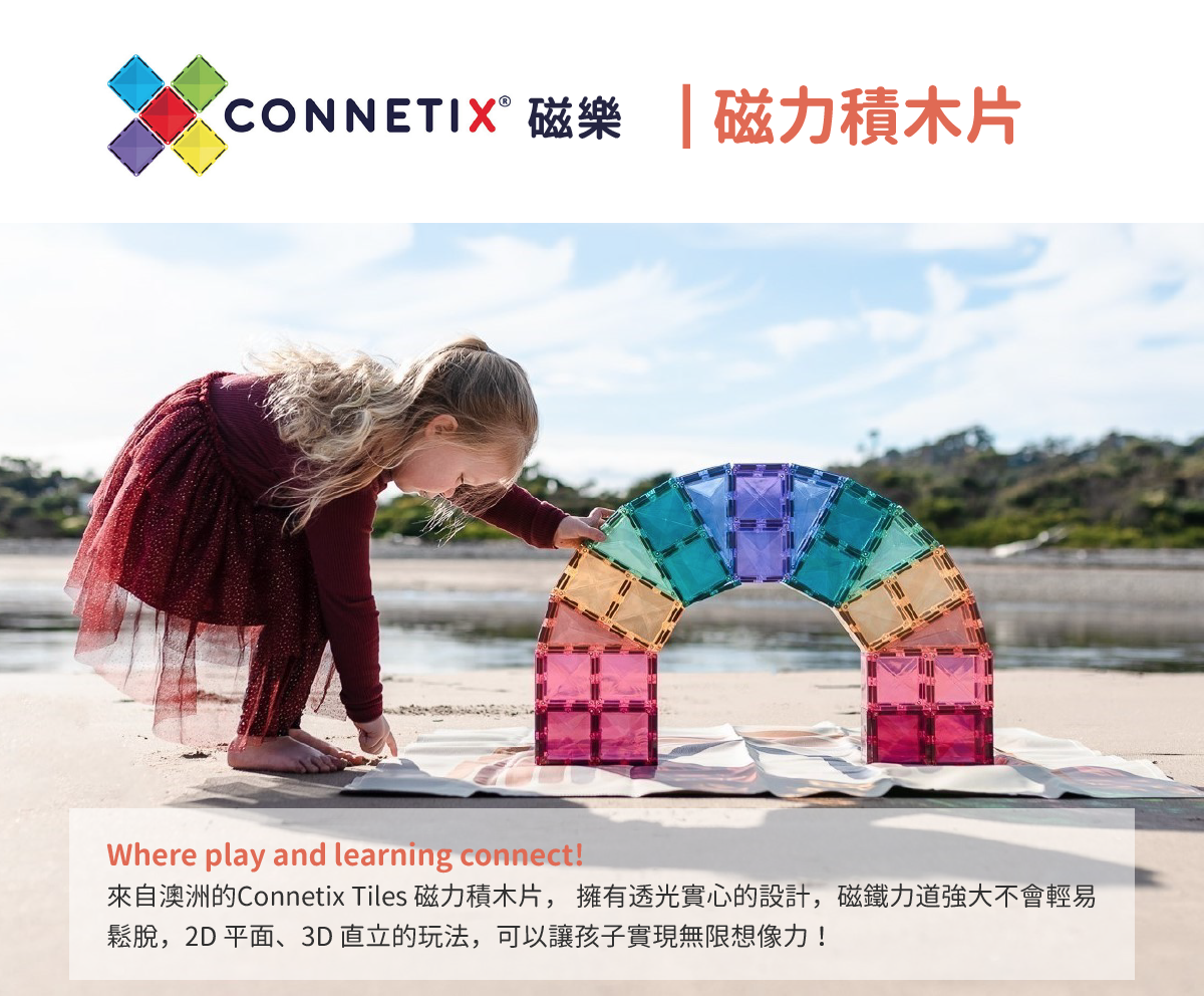 Where play and learning connect! 來自澳洲的Connetix Tiles 磁樂®磁力積木片, 擁有透光實心的設計,磁鐵力道強大不會輕易鬆脫,2D 平面、3D 直立的玩法,可以讓孩子實現無限想像力!