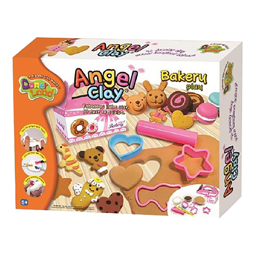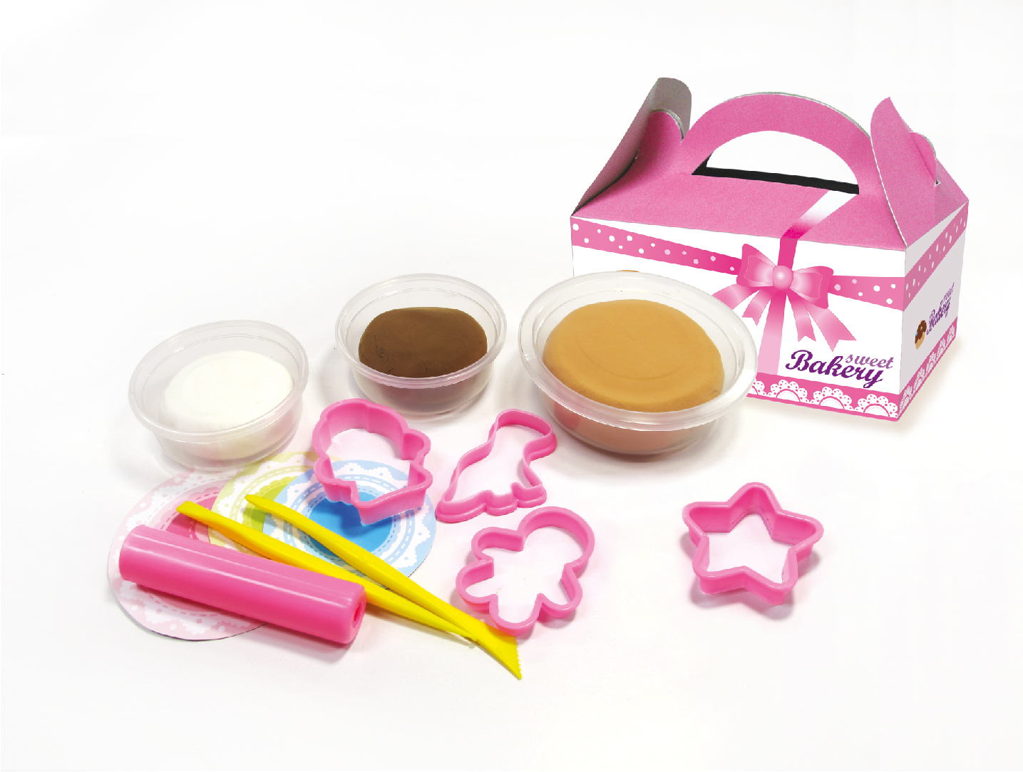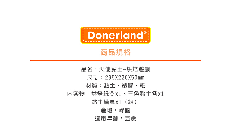 天使黏土(淺咖啡色30g、白色12g、咖啡色12g)、黏土工具、滾桿、模具四款、紙盒、說明書。
