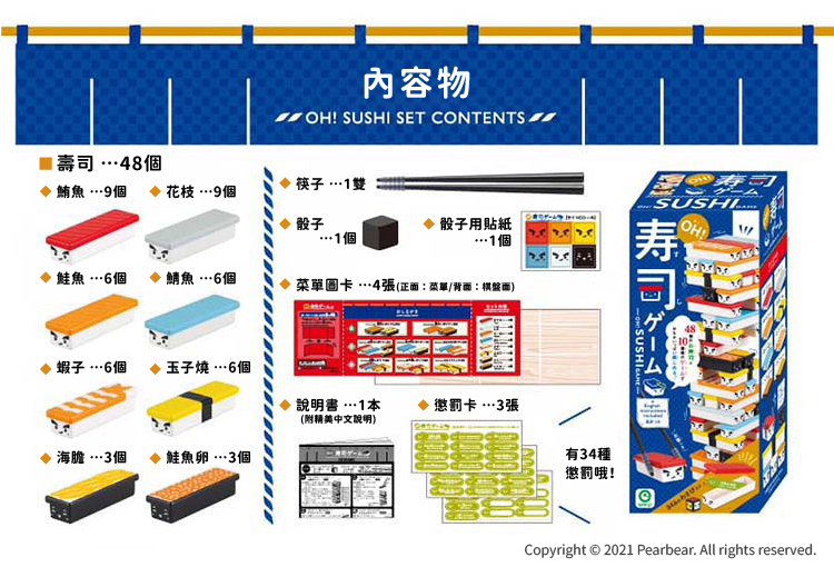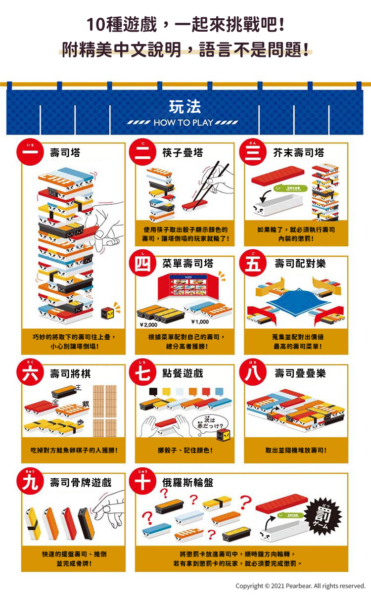令人心跳加速的壽司平衡遊戲!在深厚的日本壽司文化底下,創造出許多經典的握壽司,透過十種不同的遊戲,不論是堆疊遊戲、筷子遊戲、骨牌遊戲等,都能夠讓全家人歡樂遊玩在一起,小心不要抽中懲罰卡!