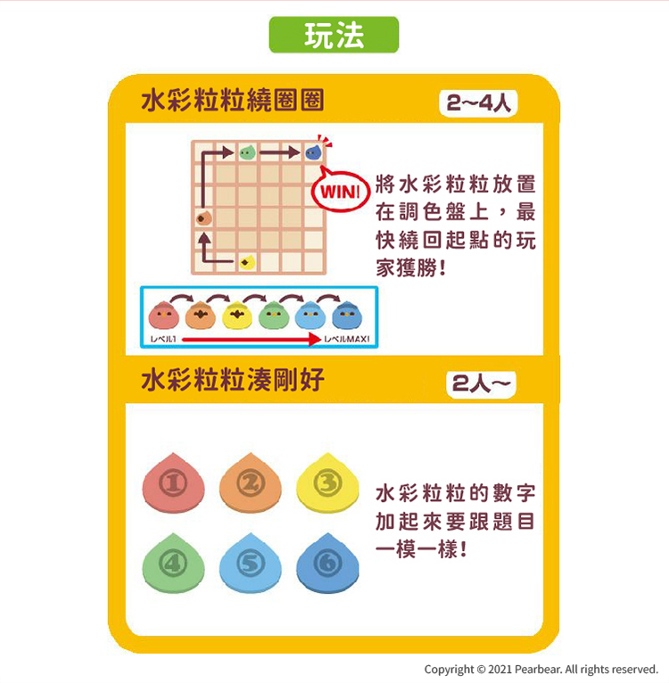 將水彩粒粒放置在調色盤上,最快繞回起點的玩家獲勝!