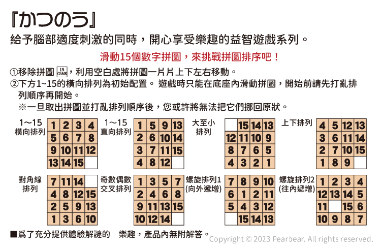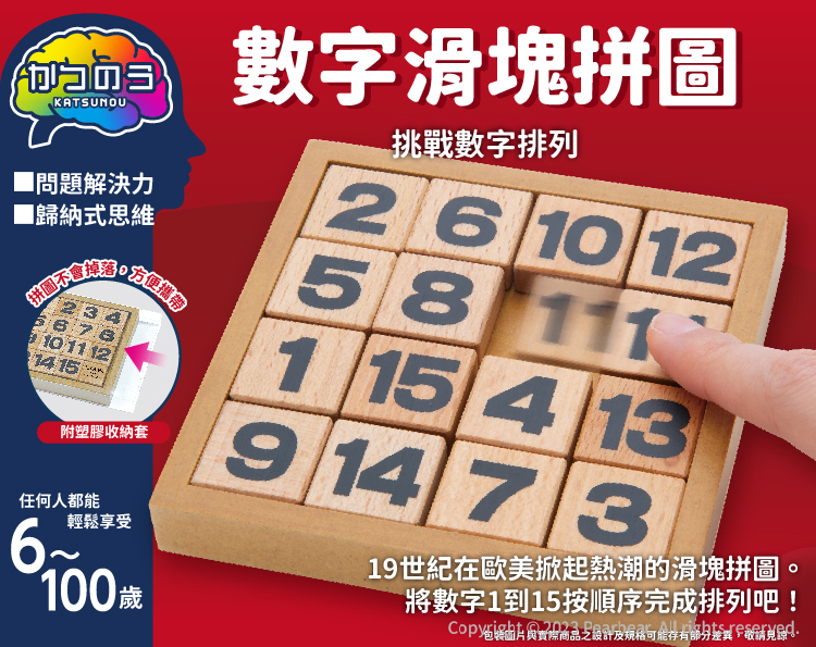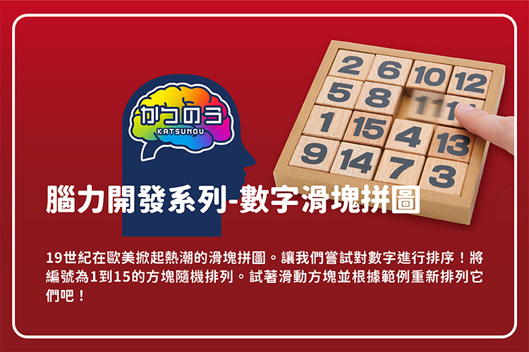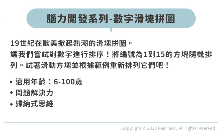 腦力開發系列-數字滑塊拼圖。讓我們一起挑戰數字排序的能力!這款遊戲中,我們將會有15塊編號從1到15的方塊,它們被隨機排列在一個盤面上。現在,試著利用滑動方塊的方式,將它們重新按照範例進行排列吧!這款遊戲不僅適合6歲以上的小朋友玩,也非常適合100歲的長者挑戰自己的腦力。快來參與這個有趣且挑戰的數字滑塊拼圖遊戲吧!