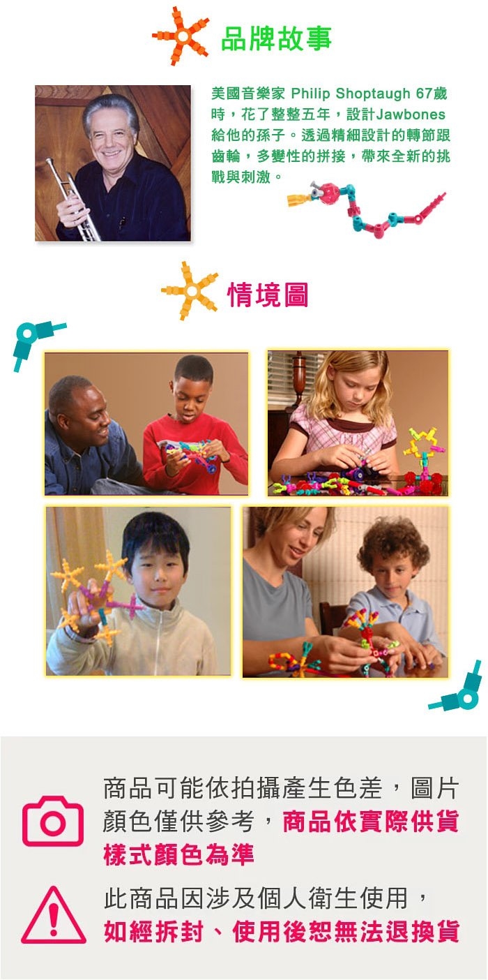 美國 Jaw Bones 3D 龍骨接接棒結合了藝術與邏輯,不論是輪子,球形,連接桿,轉軸或是U行夾,都可以在小孩子的創意下,發揮出非常特別的造型。一旦有了建構的概念之後,小朋友就可以天馬行空地進行創作,有效激發小朋友的想像力。