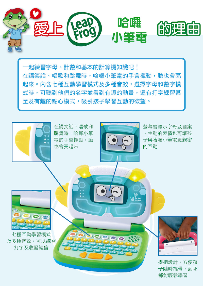 在講笑話、唱歌和跳舞時,哈囉小筆電的手會揮動,臉也會亮起來。內含七種互動學習模式及多種音效,選擇字母和數字模式時,可聽到他們的名字並看到有趣的動畫,還有打字練習甚至有趣的點心模式,吸引孩子學習互動的欲望。