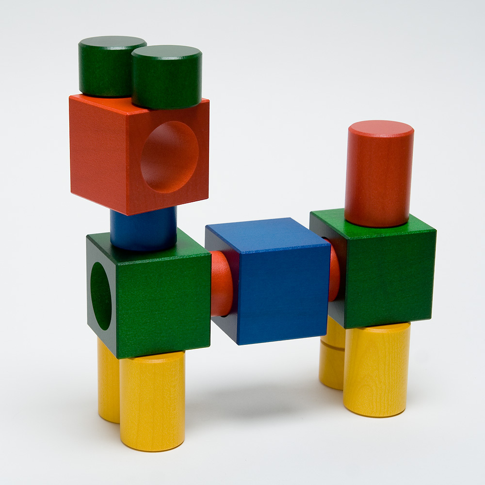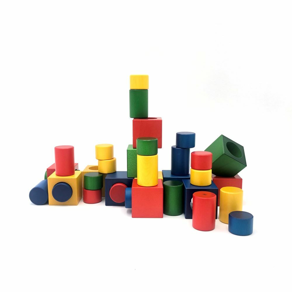 • 結構簡單的積木,根據孩子的年齡,發展成高級積木遊戲,如堆疊、將圓柱體裝入立方體、連接成關節等。