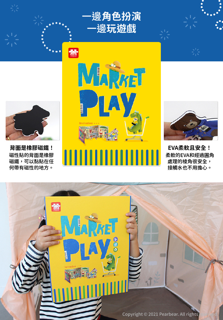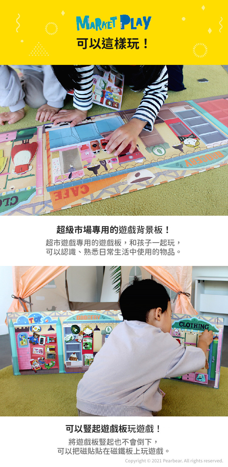 透過超級市場遊戲板,在玩樂的同時可以認識日常生活中使用的物品。有一個結帳櫃台,可以角色扮演結帳與購物,有助於提高思維能力,發展創造力!