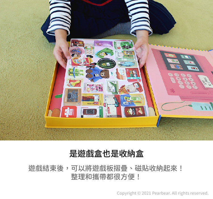 內容物:遊戲盒x1、雙面遊戲板x1、物品磁性貼共48個