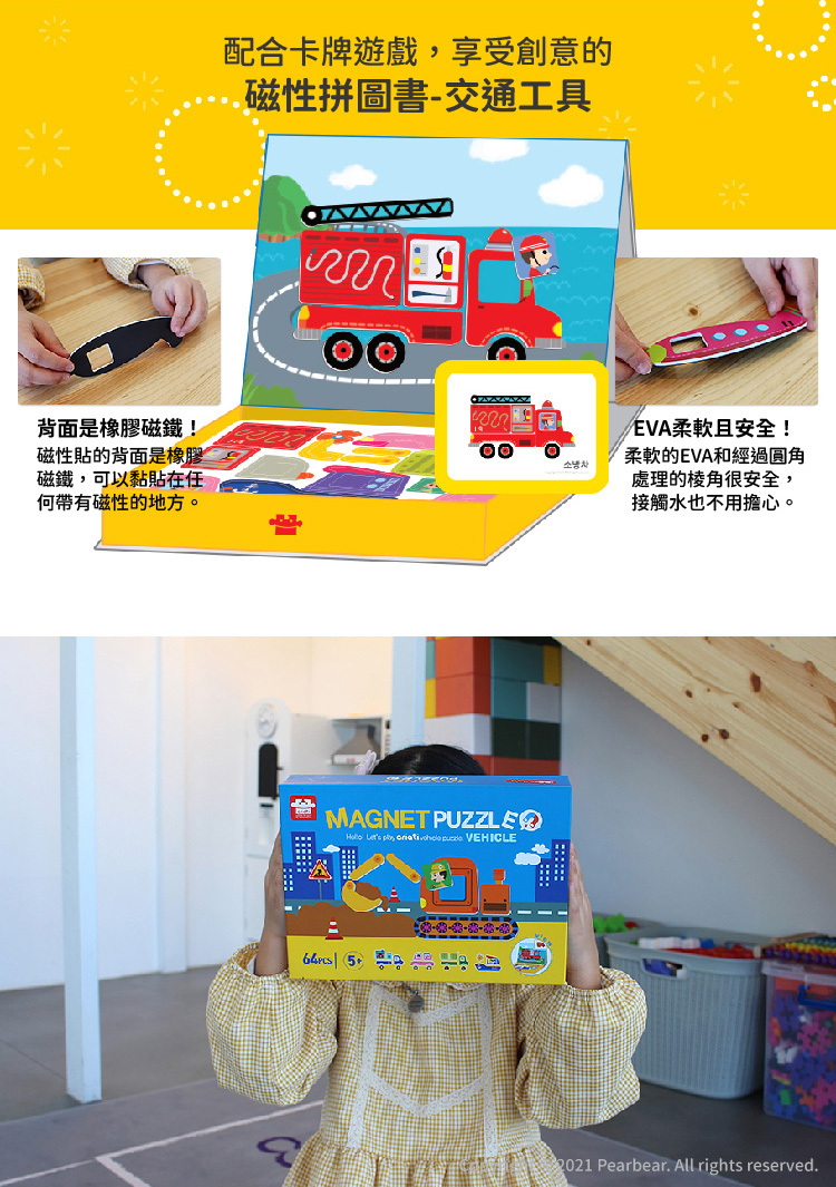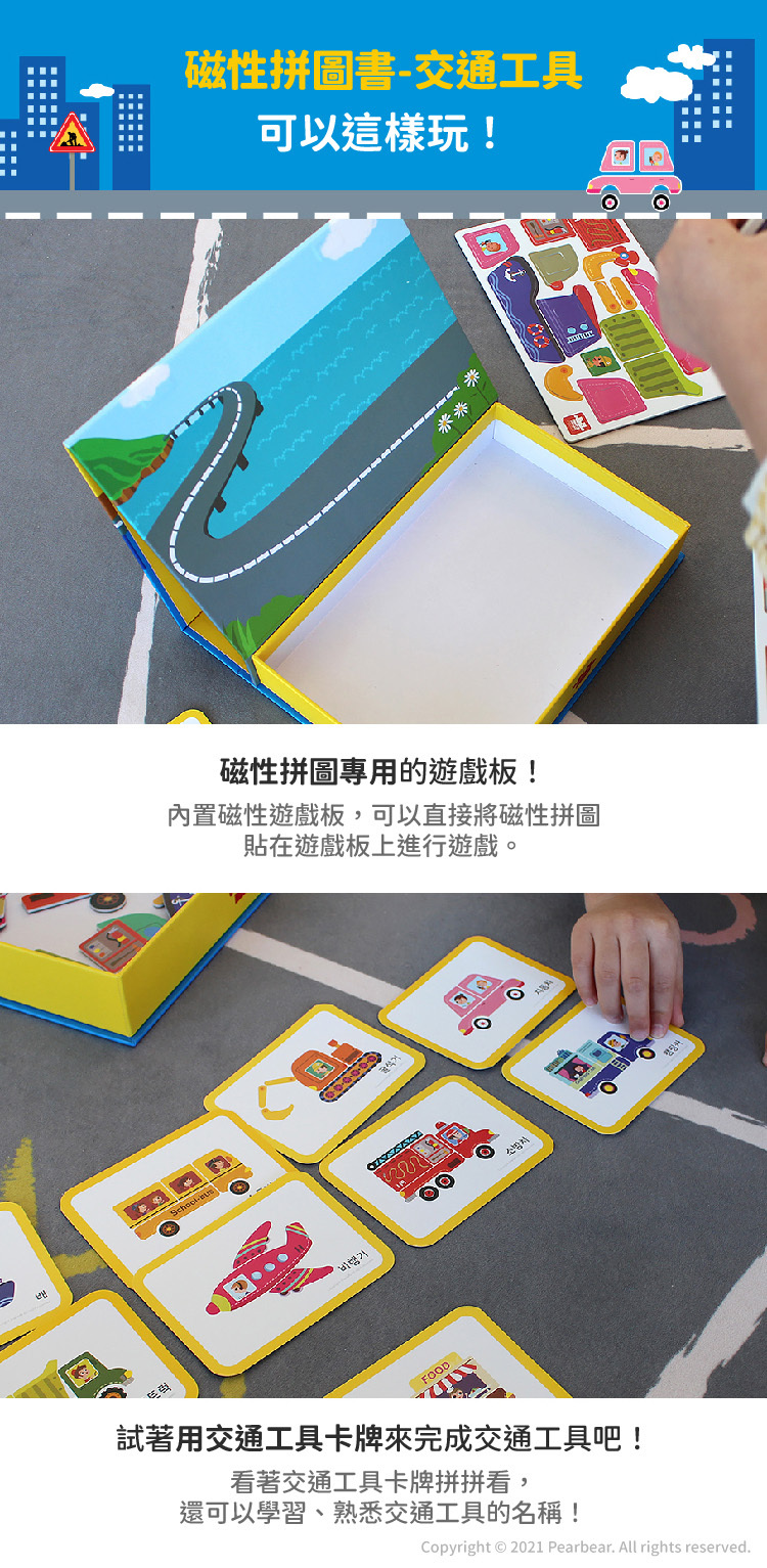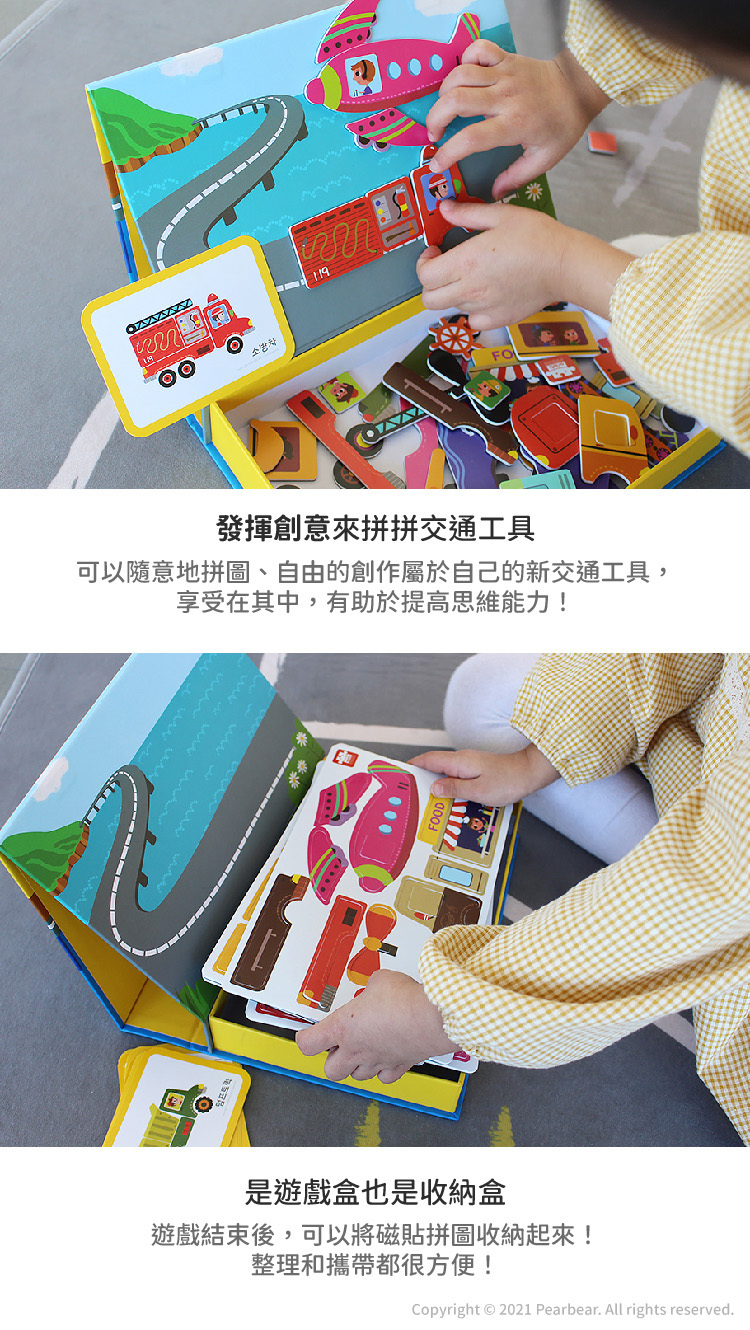 多塊磁性拼圖創意玩樂,10張交通工具卡牌,帶孩子認識交通工具,自由地創造屬於自己的創意。