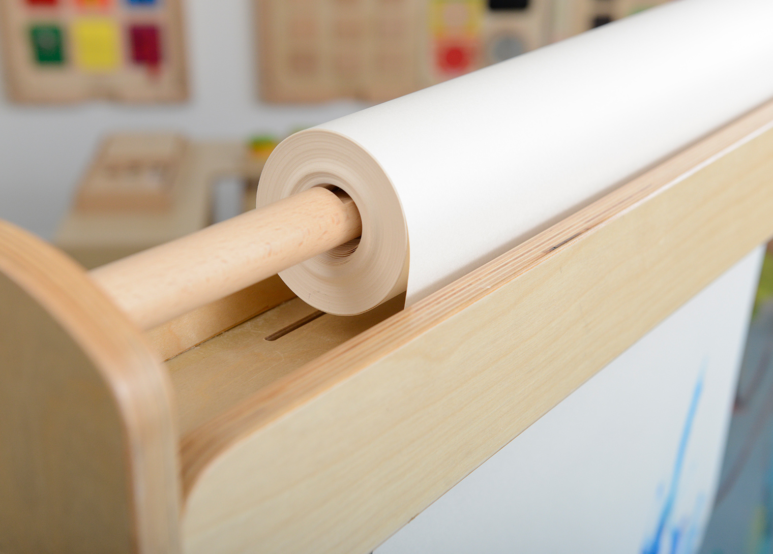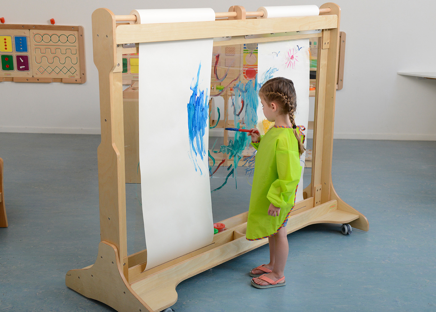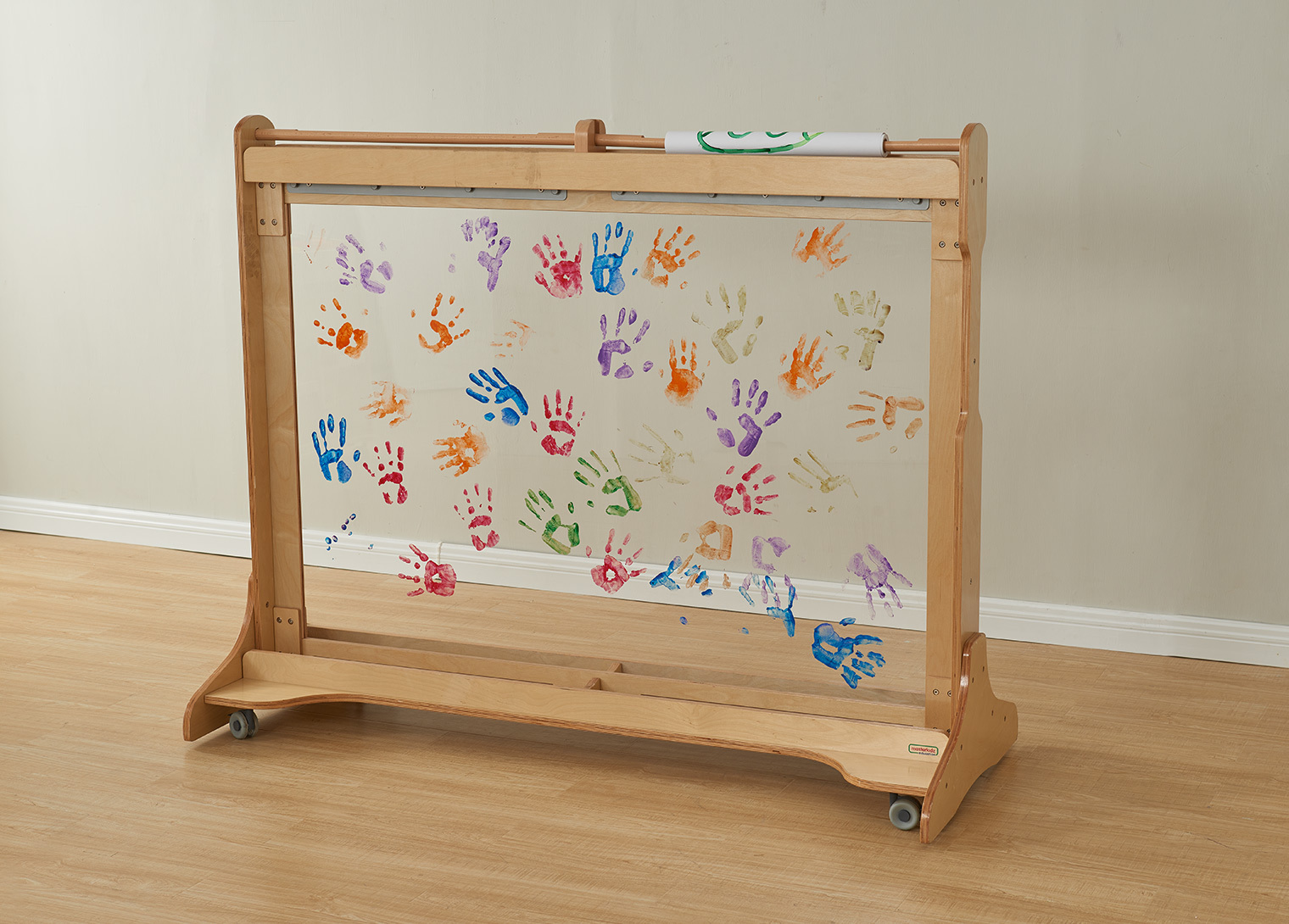 • 巨型活動塗鴉薔托盤底部兩邊可以放置顏料和畫筆,畫板上方可以放置兩捲紙捲,畫板底部輪子可以活及固定。
