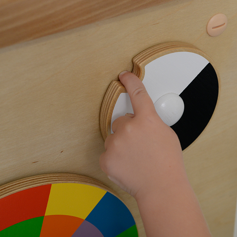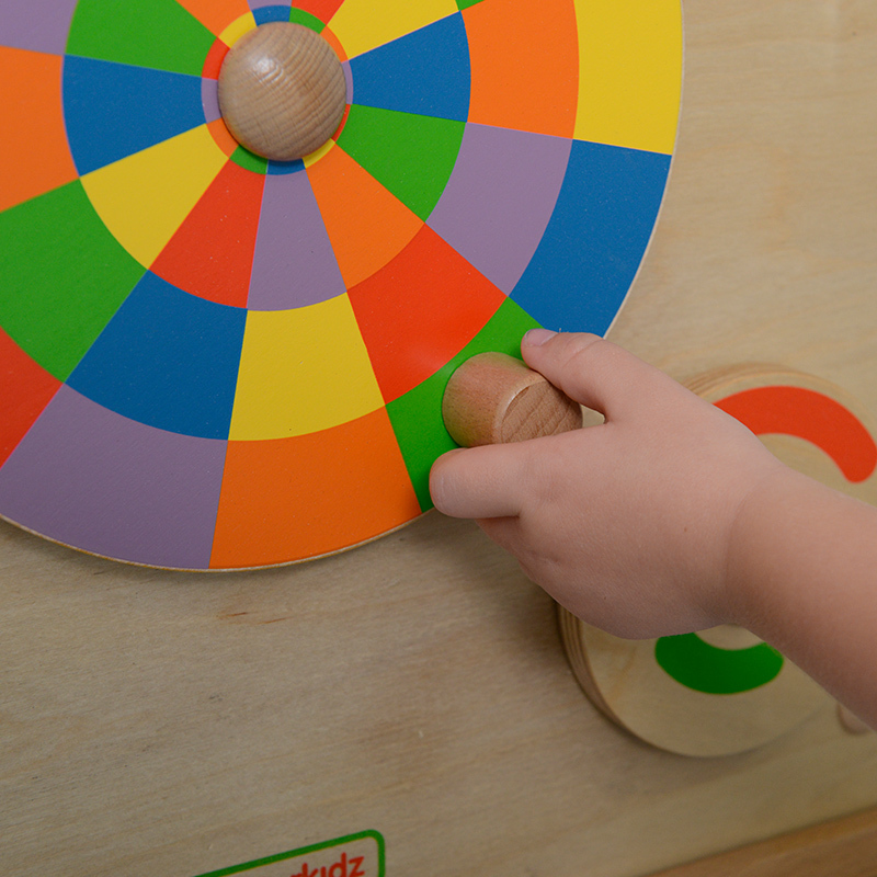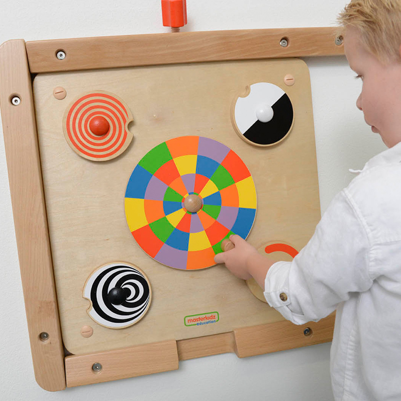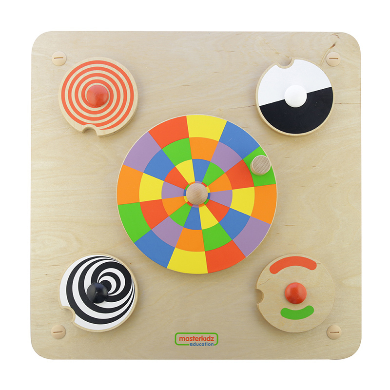 視覺旋轉遊戲是由五個色彩豐富的輪子組成,旋轉色彩斑斕的輪子給幼兒一種視覺刺激感,這是多年以受歡迎的產品,也能培養專注力喔!