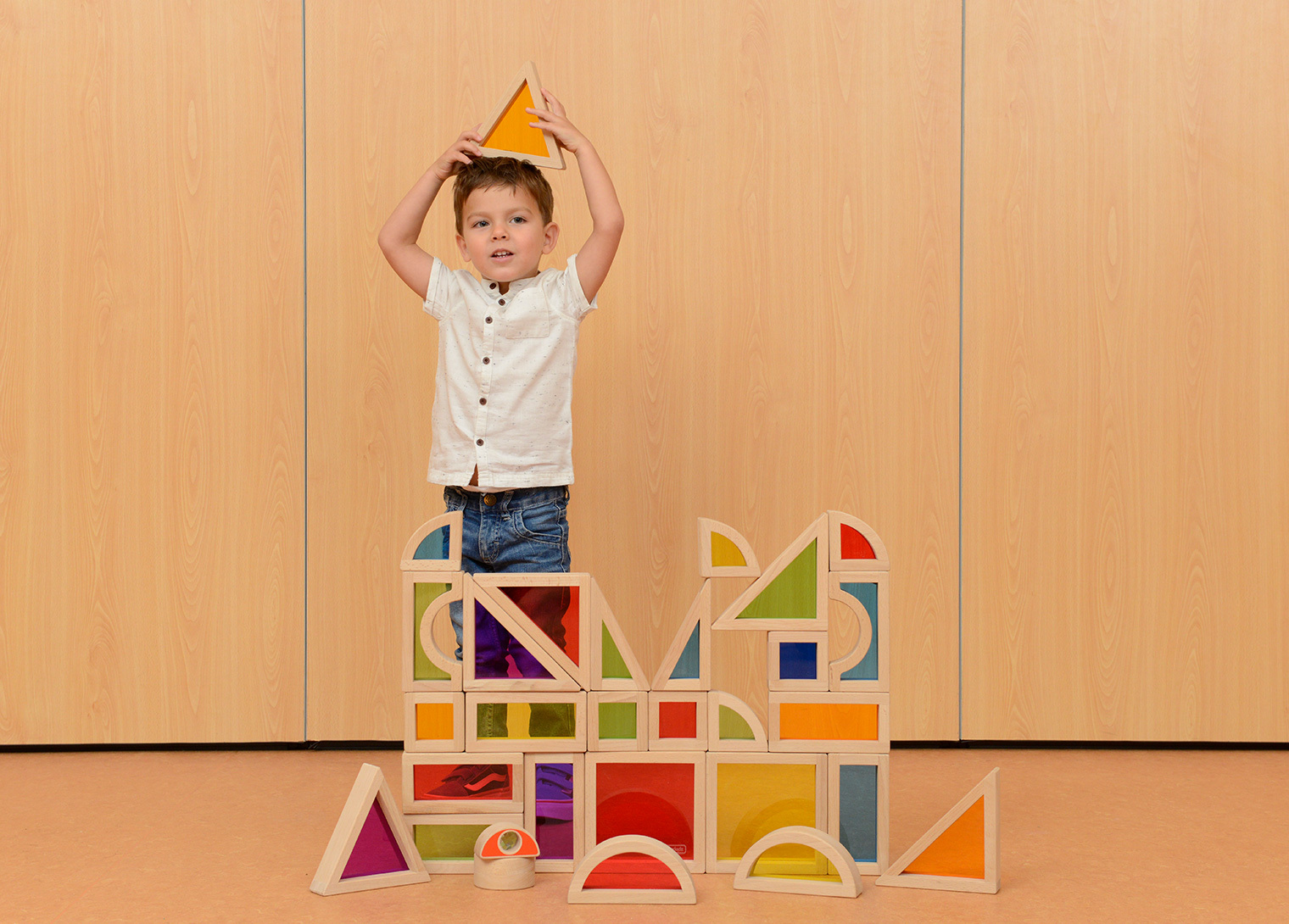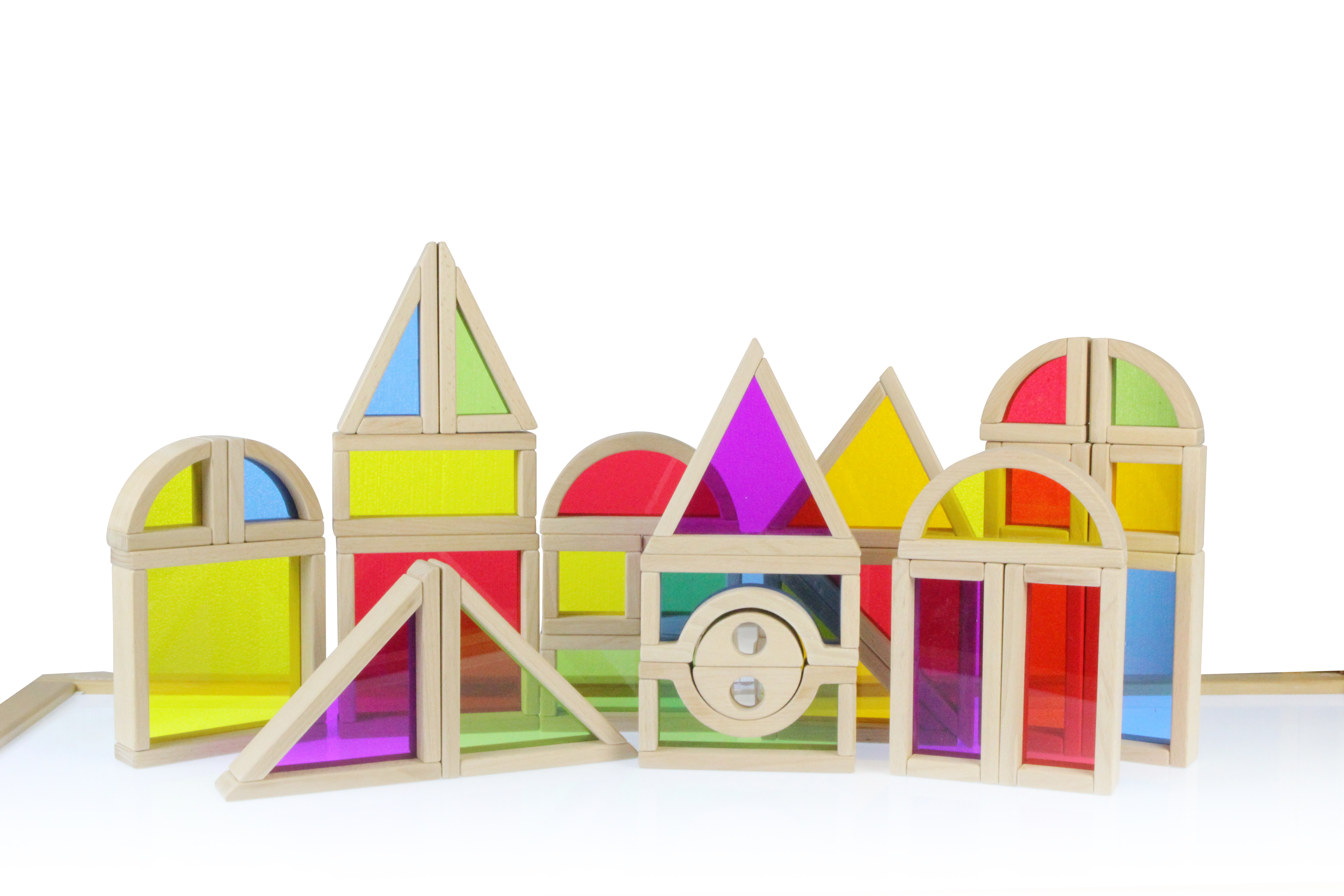 共30件不同形狀、大小積木,可自由建構,提升幼兒想像力與創造力,並可透過不同顏色組合,認識色彩混色的奇妙現象。
