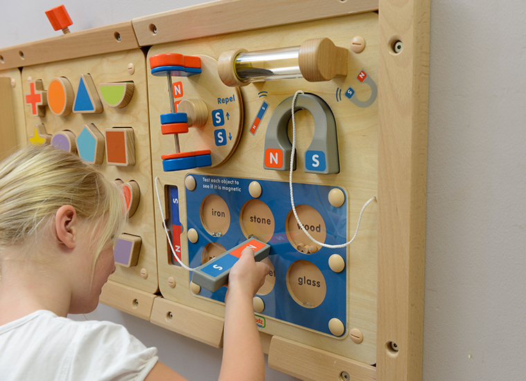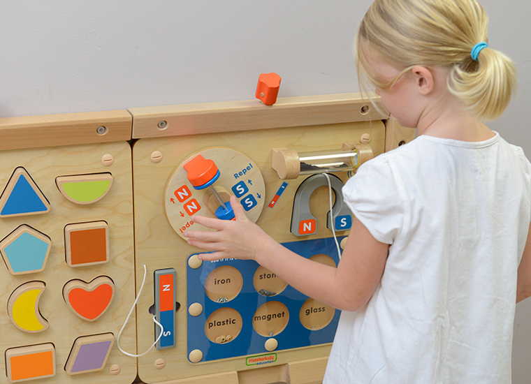 透過手握條形磁鐵或馬蹄磁鐵,了解到不同物料的磁力反應;通過旋轉磁塊轉盤,明白同極相斥作用下,磁力怎麼抵消地吸引力。