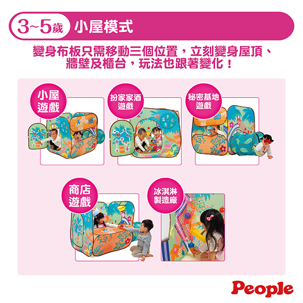 3~5歲左右 小屋模式:變身布板只需移動三個位置,立刻變身屋頂、牆壁及櫃台,玩法也跟著變化!