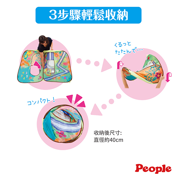 配合爬行、坐立、站立不同成長階段,擁有30種以上不同玩法,以開放式設計,亦可變身小屋或商店~遊戲超多元性,讓寶寶玩的期間更長久,是一項結合腦力及體力的球屋玩具喔!另附收納袋,摺疊後直徑約40cm,輕巧不占空間。