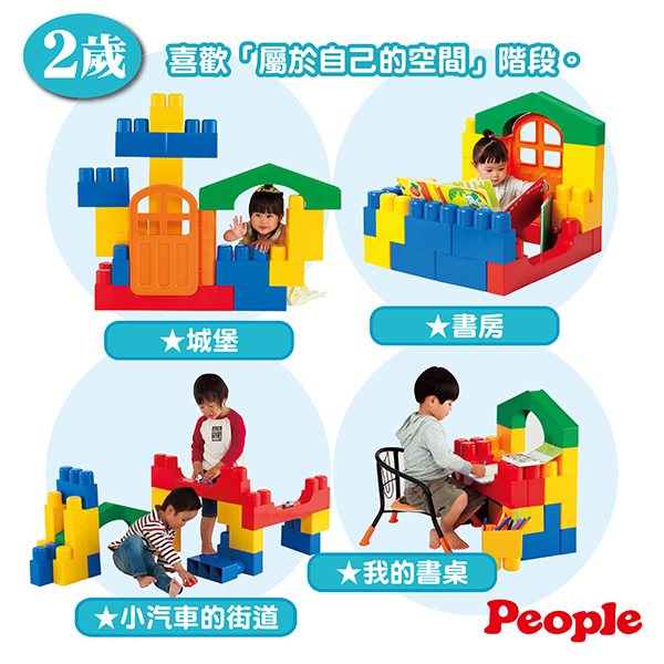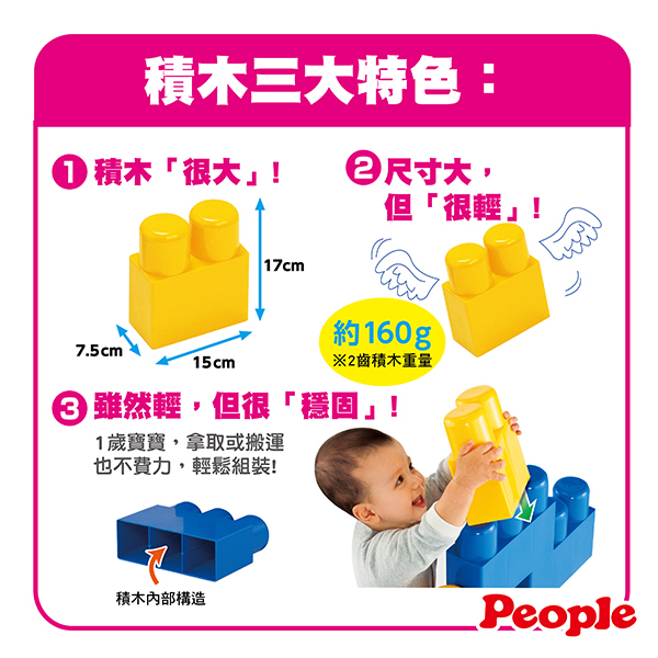 • 積木「很大」:不像小積木手指操作較不易,大尺寸大大滿足1歲孩子的組裝樂趣!