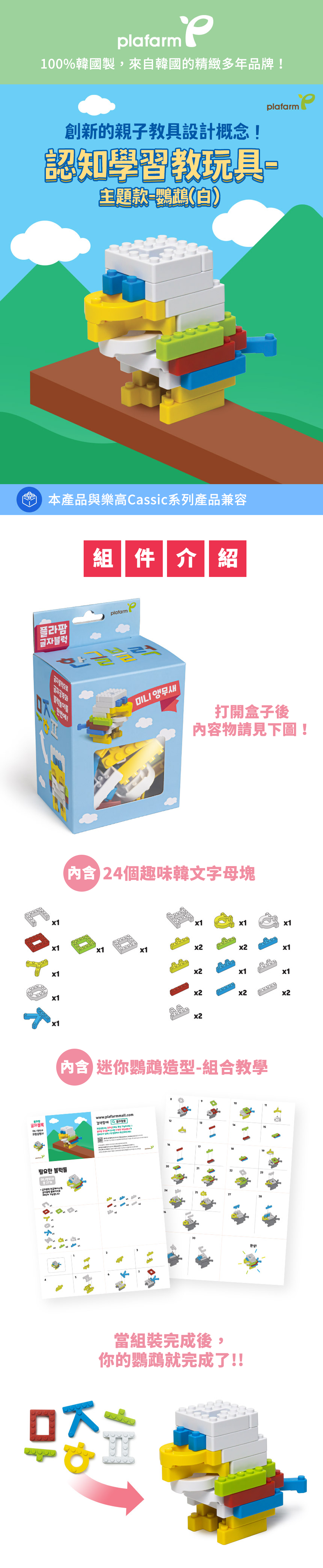 韓國Plafarm認知學習教玩具系列,由韓國30多年產品生產商Plafarm플라팜設計生產,擁有高度的專業經驗與品質。除了組合成說明書的作品之外,更能創造出無限型態的創意作品!使用ABS材質,穩定性高、強韌、耐衝擊。擁有豐富繽紛的顏色,不但能夠吸引孩子的目光,並且在動手組合的過程中,能夠增加手指各部位小肌肉的使用,對於孩子手部精細動作的各種運用能力,可以有直接的幫助!從初學者適合的2D挑戰題目,一直到需要使用更多組件結合而成的立體作品,每個孩子都可以找到屬於自己的遊戲方式!與家人/朋友一起遊戲的時光,不妨可以準備一套Plafarm認知學習教玩具,一起在快樂的遊戲氛圍中自然學習。