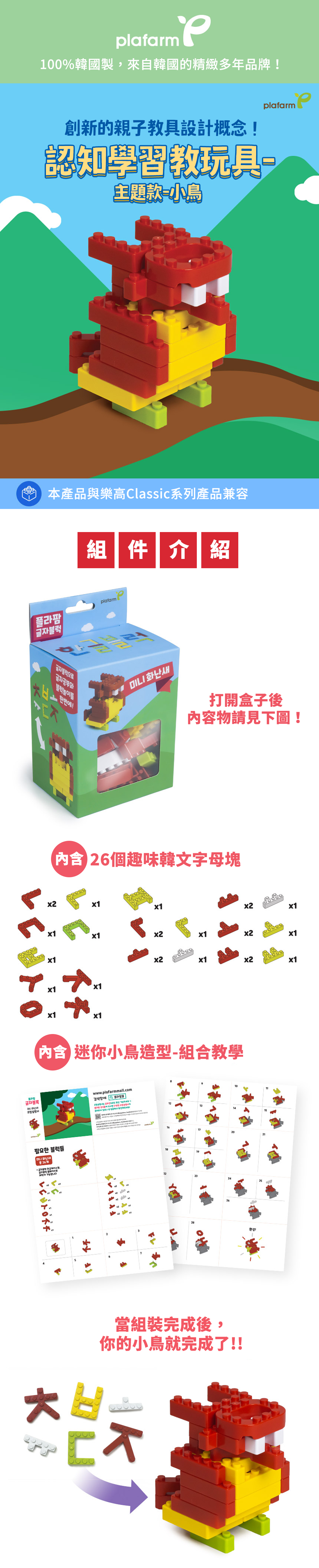 有30多年歷史的韓國「Plafarm認知學習教玩具」 由韓國30多年產品生產商Plafarm設計生產的---Plafarm認知學習教玩具系列,是一套能夠讓孩子從遊戲中自然練習觀察力創新教玩具。 具有組合功能,增加的趣味性 韓國Plafarm認知學習教玩具系列,由韓國30多年產品生產商Plafarm플라팜設計生產,擁有高度的專業經驗與品質。除了組合成說明書的作品之外,更能創造出無限型態的創意作品!使用ABS材質,穩定性高、強韌、耐衝擊。擁有豐富繽紛的顏色,不但能夠吸引孩子的目光,並且在動手組合的過程中,能夠增加手指各部位小肌肉的使用,對於孩子手部精細動作的各種運用能力,可以有直接的幫助!從初學者適合的2D挑戰題目,一直到需要使用更多組件結合而成的立體作品,每個孩子都可以找到屬於自己的遊戲方式!與家人/朋友一起遊戲的時光,不妨可以準備一套Plafarm認知學習教玩具,一起在快樂的遊戲氛圍中自然學習。 ![]() |