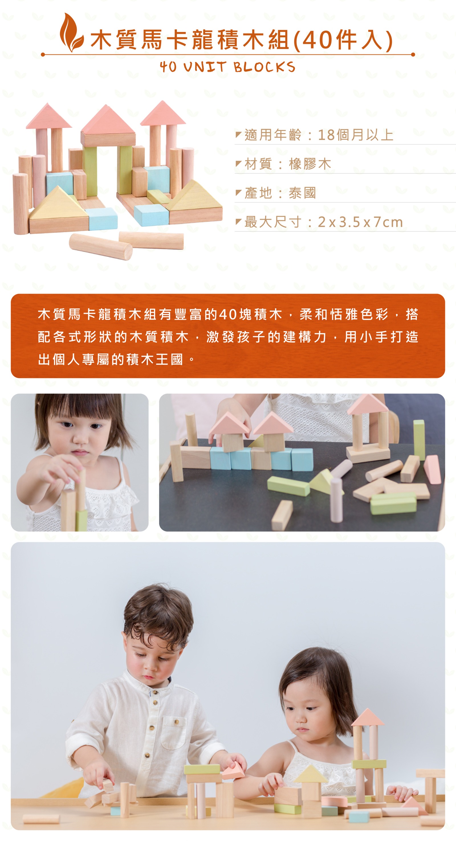 木質馬卡龍積木組有豐富的40塊積木、柔和恬雅色彩,