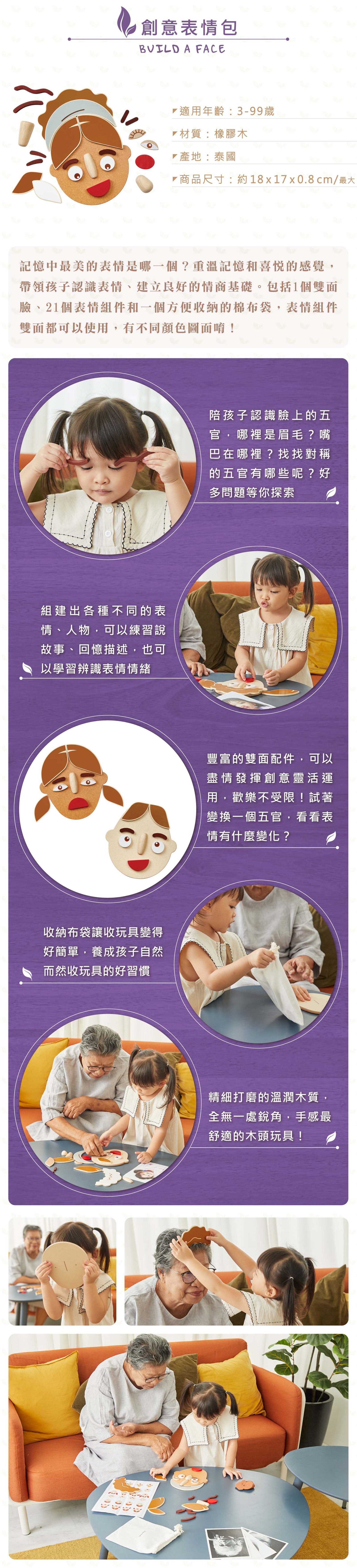 包括1個雙面臉、21個表情組件和一個放便收納的棉布袋,