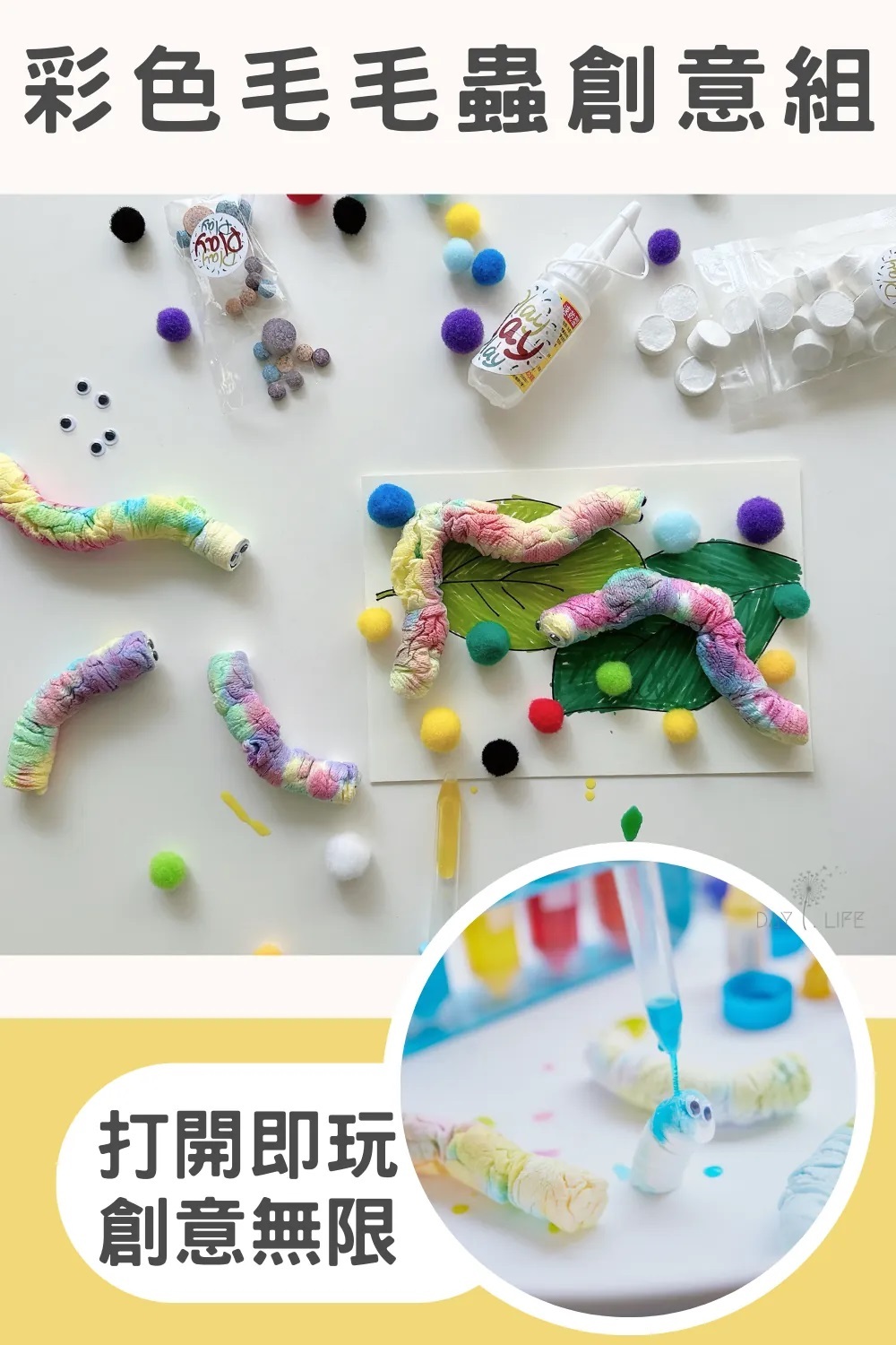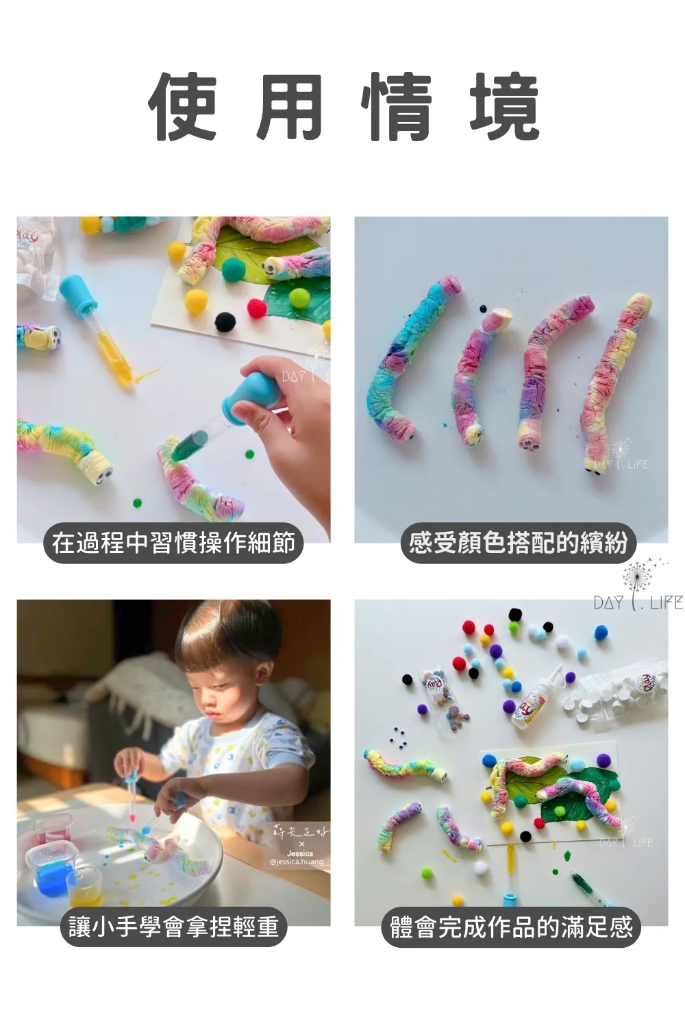 彩色毛毛蟲創意組合,透過製作毛毛蟲的過程中,讓孩子可以熟悉細節上的操作,以及色彩上的混合調配,看著毛毛蟲碰到水會慢慢扭動,真的非常療癒的!