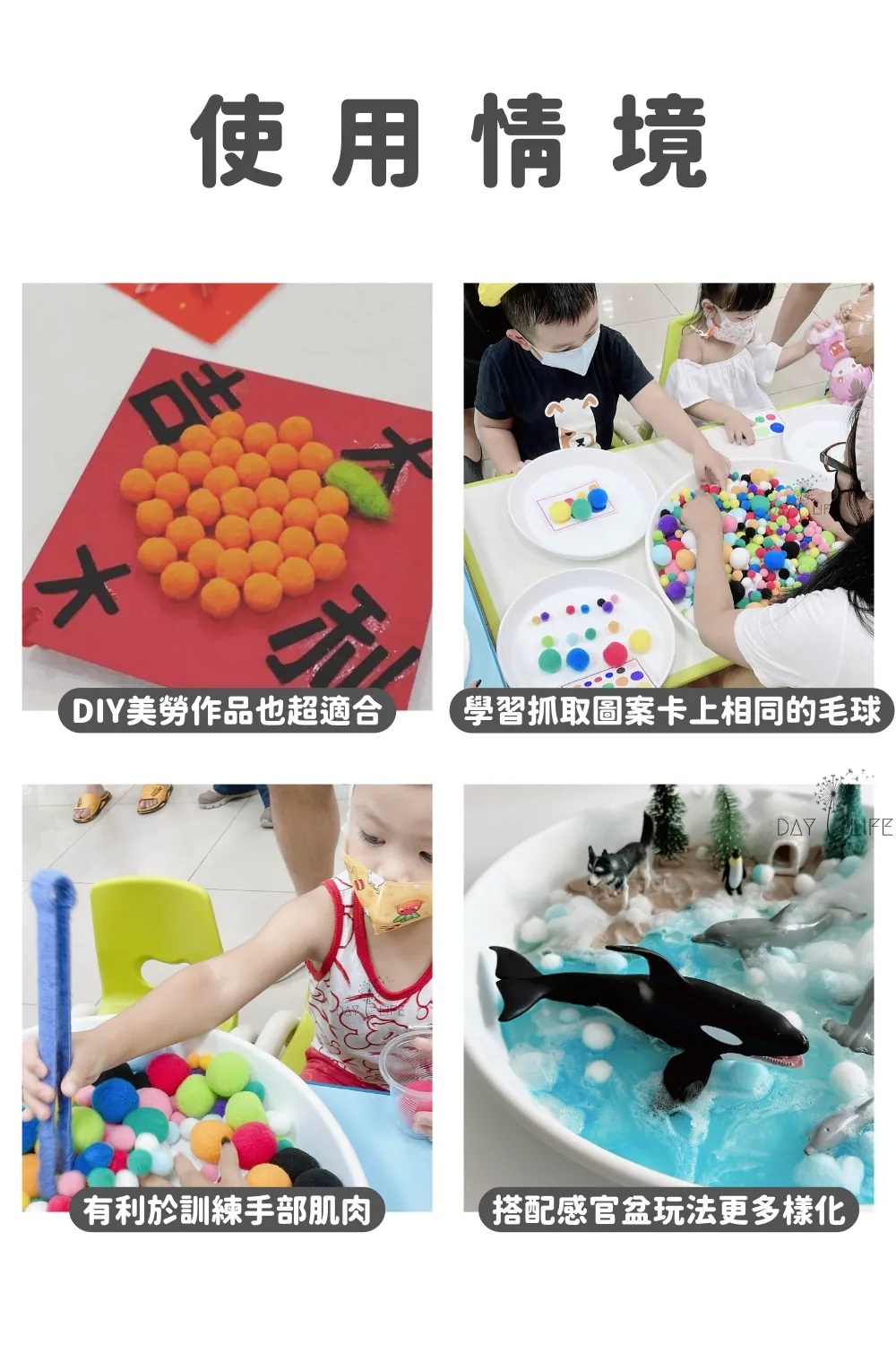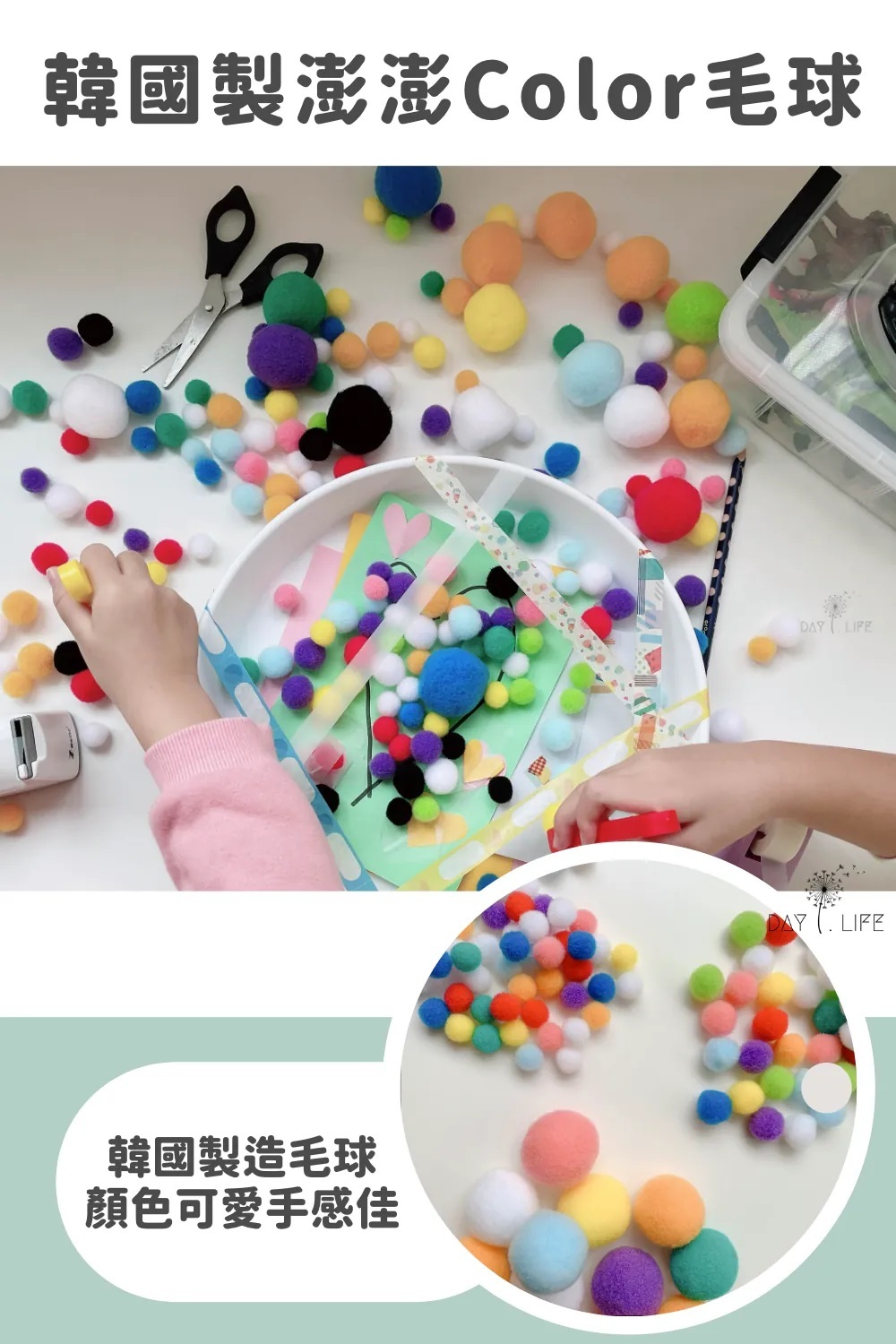 從寶寶到大孩子的勞作通通都適合,可以讓他們學習顏色辨認、訓練小肌肉、練習拿筷子,澎澎的手感療癒又好玩,各種年齡的孩子都可以玩得不亦樂乎!甚至連貓咪都能舒服地窩在毛球堆裡🐱