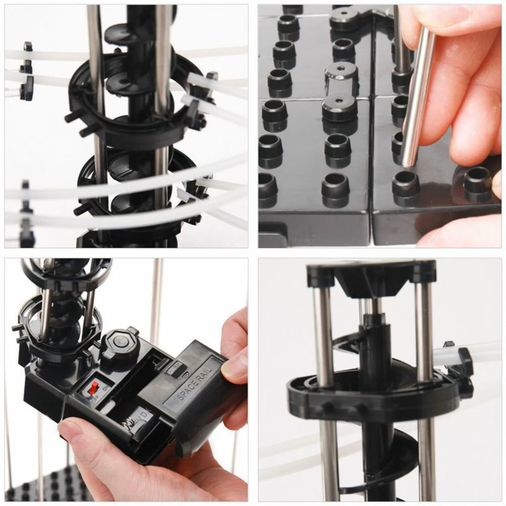 經由自己架設軌道,可以讓鋼珠們自己在軌道內如同雲霄飛車般的運轉。