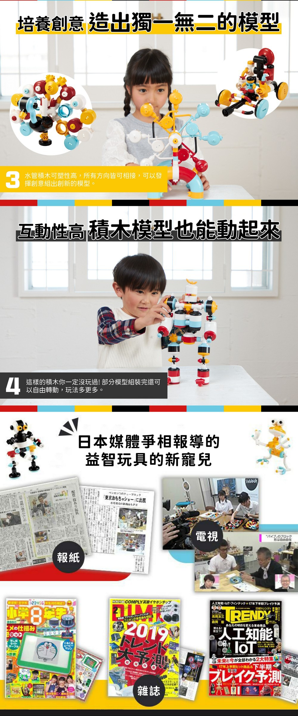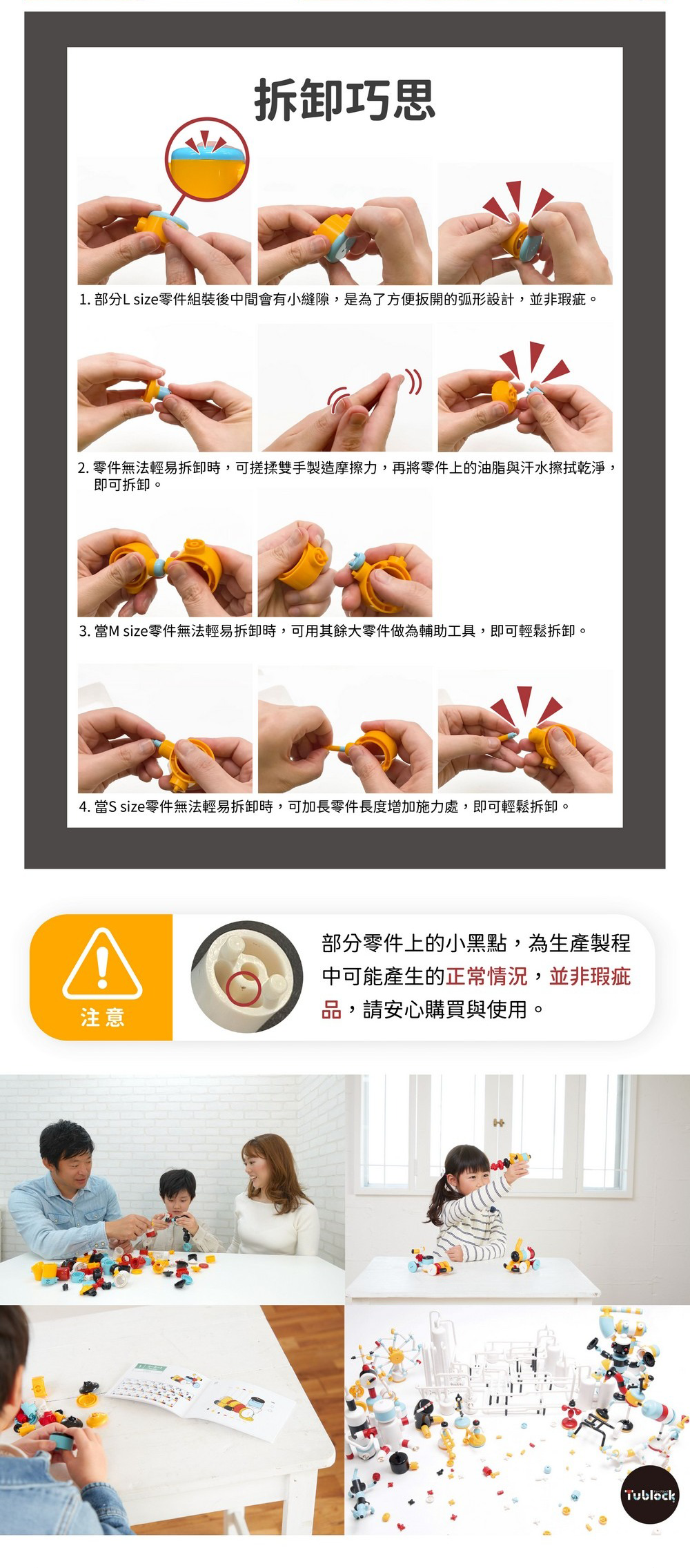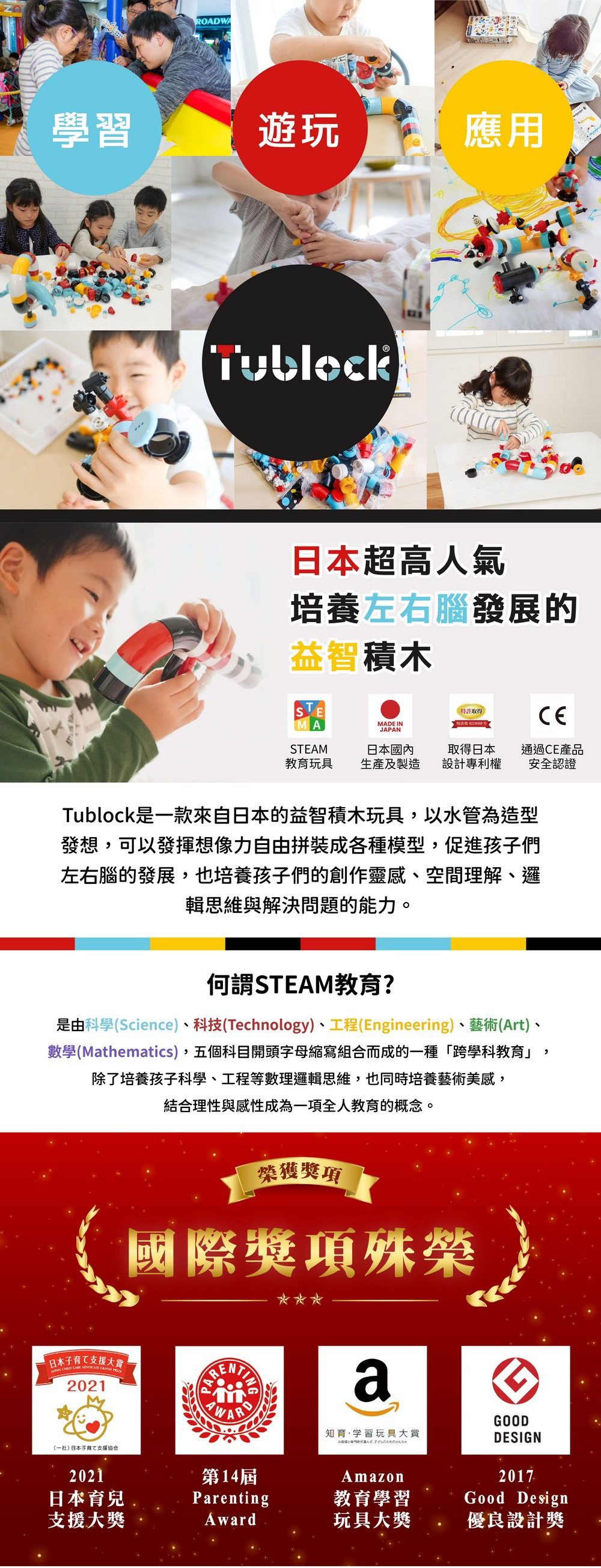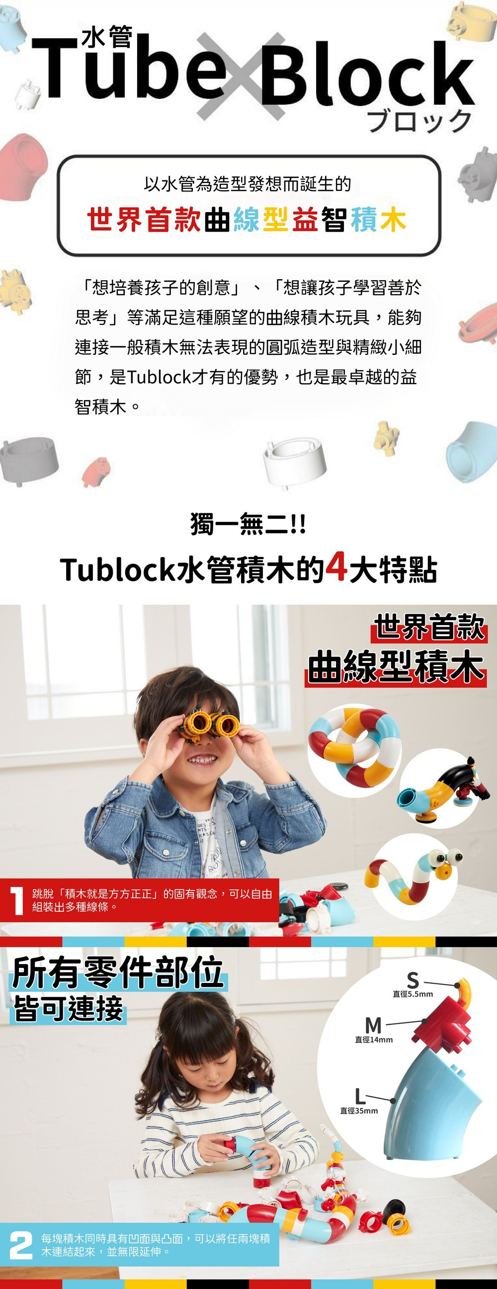 Tublock是一款來自日本的益智積木玩具,以水管為造型發想,可以發揮想像力自由拼裝成各種模型,促進孩子們左右腦的發展,也培養孩子們的創作靈感、空間理解、邏輯思維與解決問題的能力。
